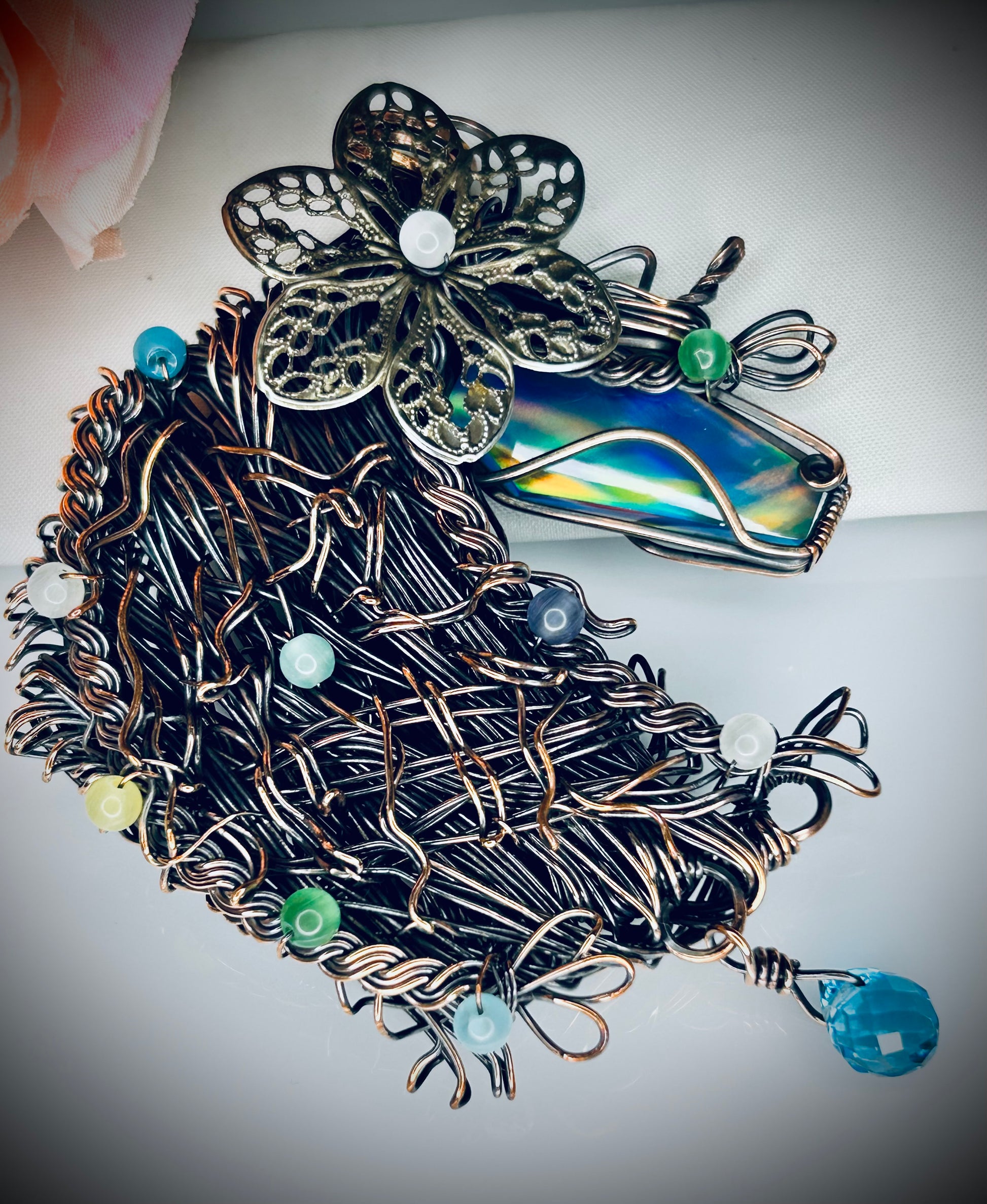 Every pendant begins with the Aurora Opal coffin stone, selected for its quiet fire and chatoyant flashes. It is meticulously wrapped in oxidized copper wire by hand, with patient turns and precise spirals that cradle the stone without compromising its glow. The process demands hours of hand-work: shaping, binding, and reflocking the patina, then sealing with a gentle, satin-bright polish. A fine, secure bezel catches the labors in place, ensuring the stone endures daily wear.
